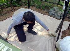 Для того, чтобы предотвратить произрастание травы в швах между плитками, мы уложили на территории участка геотекстиль, который затем засыпали пескобетонной смесью.