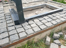 Изначально на участке находится лишь гранитный памятник прямоугольной формы и бетонный цоколь, который, по сути, бесполезен. Он не держит ограждение, не является фундаментом. Наша задача заключалась в следующем: уложить на данном объекте гранитную брусчатку.