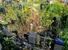 Очередной заказ по уборке небольшого места захоронения. Несмотря на наземное покрытие, на данной могиле проросли высокие сорняки, практически полностью скрывшие памятник. В целом, эта могила – яркий пример того, что случается даже с ухоженными местами захоронения без регулярной уборки.